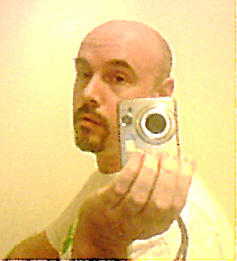 tech notes: my digital camera probably could have got a much higher-quality original to work with, but that would entail working in the bathroom mirror, and since I was going for FX anyway, original quality wasn't really a concern. I ended up snapping my source selfie in Skype using the lappy's integral cam. The FX process was just heavy-handed sharpening filter and then the oilify filter with a 4 or 5-pixel radius.