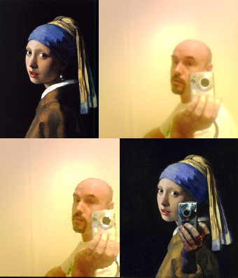 Photo taken, I then set figuring out how to compose in GIMP a 4-way of the original Vermeer, 'shop job, my pose, and an FXed version. Turns out you can't just copy from one image and paste into the other - you have to add a layer and paste into the new layer, or I think there's a right-click context menu command to create new layer and paste in one swoop. Either way, the point is... layers! So now with some basic pixel arithmetic it should now be trivial to digitize those Miami Music festival event fliers.